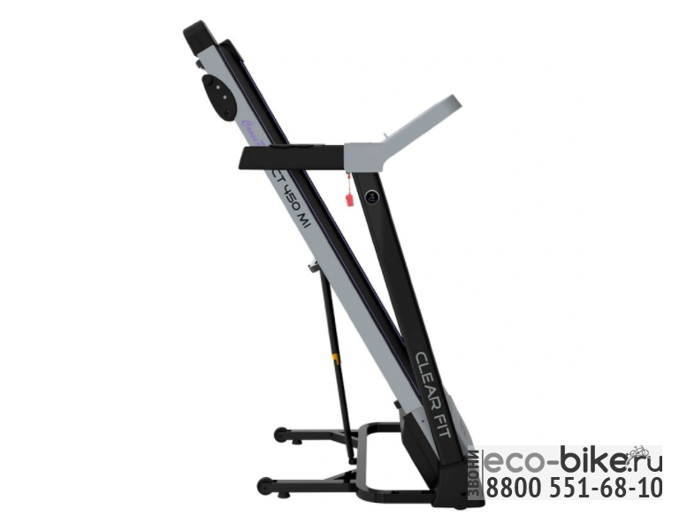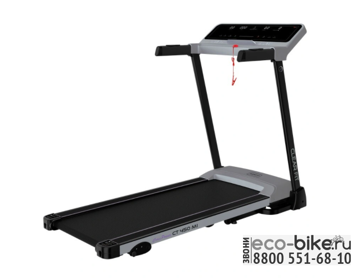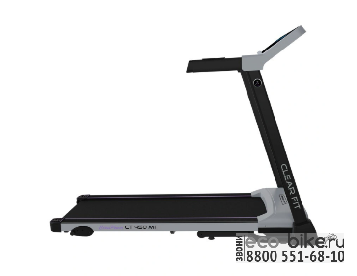 Оптимальная беговая дорожка для регулярных тренировок. Одно из преимуществ модели CLEAR FIT CT 450 MI -  это просторное беговое полотно 45 х 120 см, размеры которого создают максимальный комфорт для любой комплекции и для тренировки на любой скорости в допустимом диапазоне модели 0,8-16 км/ч. Надежный, практически бесшумный двигатель беговых дорожек серии CrossPower обеспечивает плавное изменение и стабильное движение на всех оборотах.  Прочная дека и усиленная конструкция рассчитаны для пользователей до 130 кг. Двойная система амортизации по всему периметру обеспечивает защиту от ударной нагрузки для суставов и позвоночника, подходит для всех возрастных групп пользователей. Газовый доводчик EasyDecline™ облегчает процесс складывания, обеспечивает плавное и мягкое опускание бегового полотна без усилий и шума, все для компактного хранения и простого перемещения тренажера.